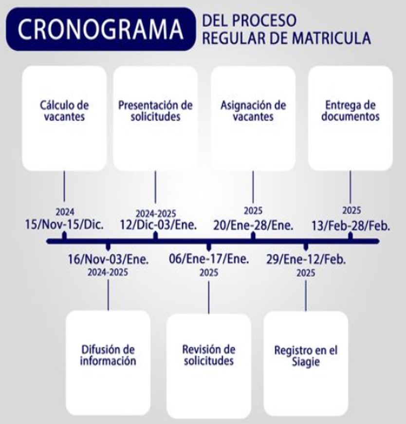 A través de los medios con los que cuente la IE o el programa, el director debe publicar información sobre el proceso de matrícula para conocimiento de las familias. La publicación debe incluir (i) información sobre la cantidad de vacantes, (ii) medios y/o canales de atención disponibles, (iii) fechas y plazos para el proceso. La información sobre la cantidad de vacantes debe actualizarse de manera periódica para que las familias puedan saber si la IE o programa cuenta o no con vacantes a la fecha de consulta.